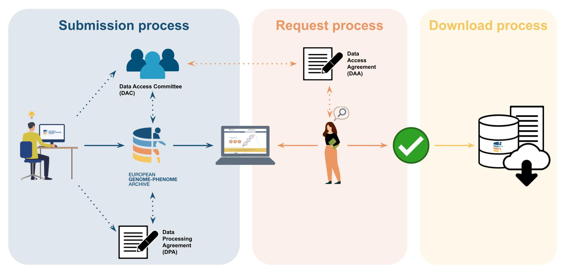 To start a submission, you need to become an EGA submitter. For that, youll need to sign a Data Processing Agreement (DPA) with us, that defines the terms and conditions under which your data will be processed and shared within the EGA system. The access to each study is controlled by its Data Access Committee (DAC). The DAC is responsible for managing data access requests and ensuring that the release of data is in accordance with the General Data Protection Regulation (GDPR).