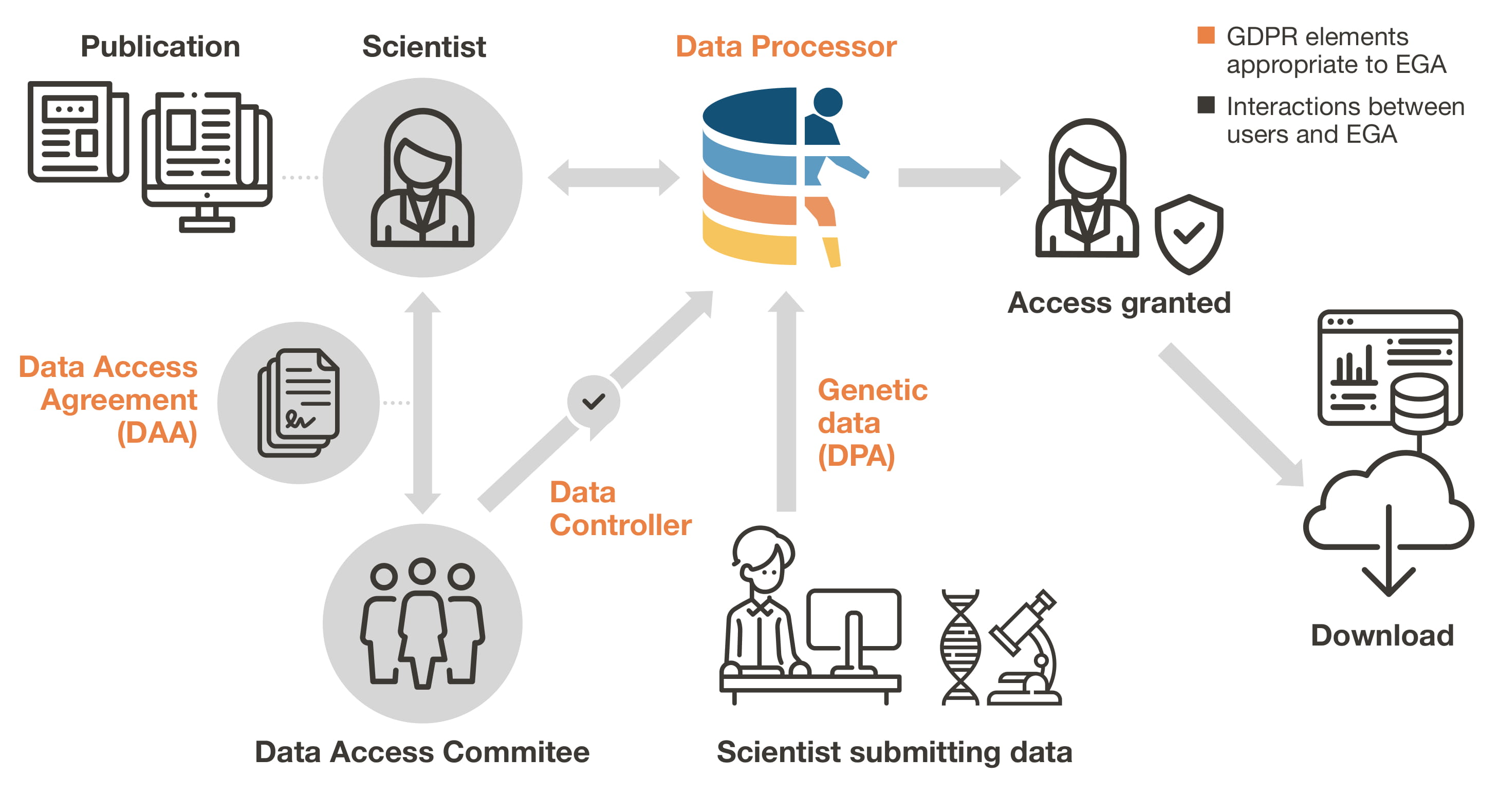 Within GDPR, there are two main actors: data controllers and data processors. Data controllers are persons or entities which determine the purposes and means that the personal data may be processed, e.g. companies, researchers, or universities. For EGA, the data controller is ultimately the data producer and the submitter(s) who submit the data to EGA. The data controller also creates a Data Access Committee (DAC) who will decide on data access permissions at EGA. Data processors are the persons or entities which process the data on behalf of a data controller. With regard to GDPR, EGA is a data processor as it processes data as instructed by the data controller. GDPR applies to any organisation which accesses personal data from an individual within the EU. Under GDPR, personal data is defined as any data that is identifiable, including names and email addresses as well as health-related and genetic data. EGA does not accept personally identifiable data except genetic and phenotypic data, so all other data submitted to EGA, such as names and addresses, must be pseudonymised. GDPR requires that data controllers implement data protection principles, such as data minimisation, to minimise the risk of data leakage, and protect the rights of the data subjects. As a data processor, EGA has a set of security policies that are followed to minimise the risk of unauthorised data access or data loss.