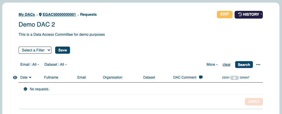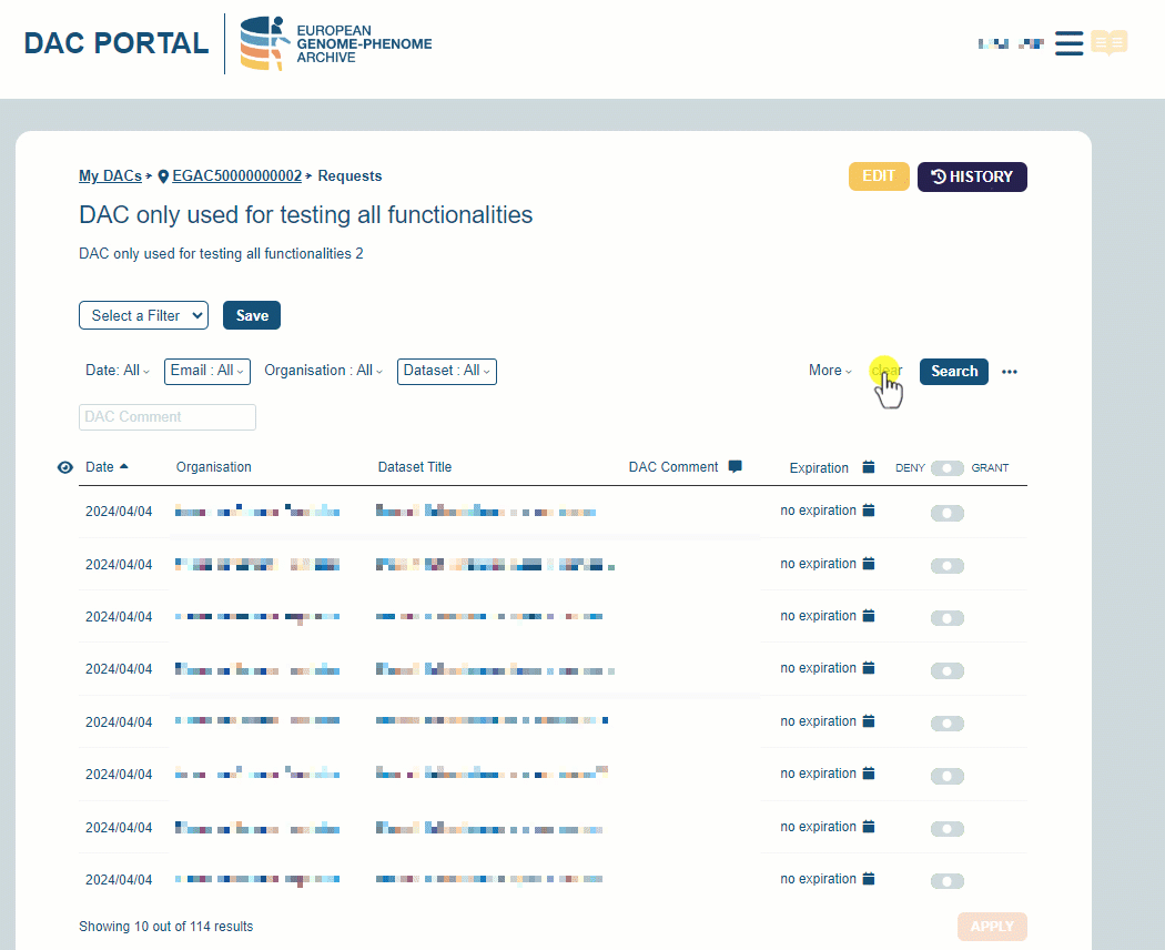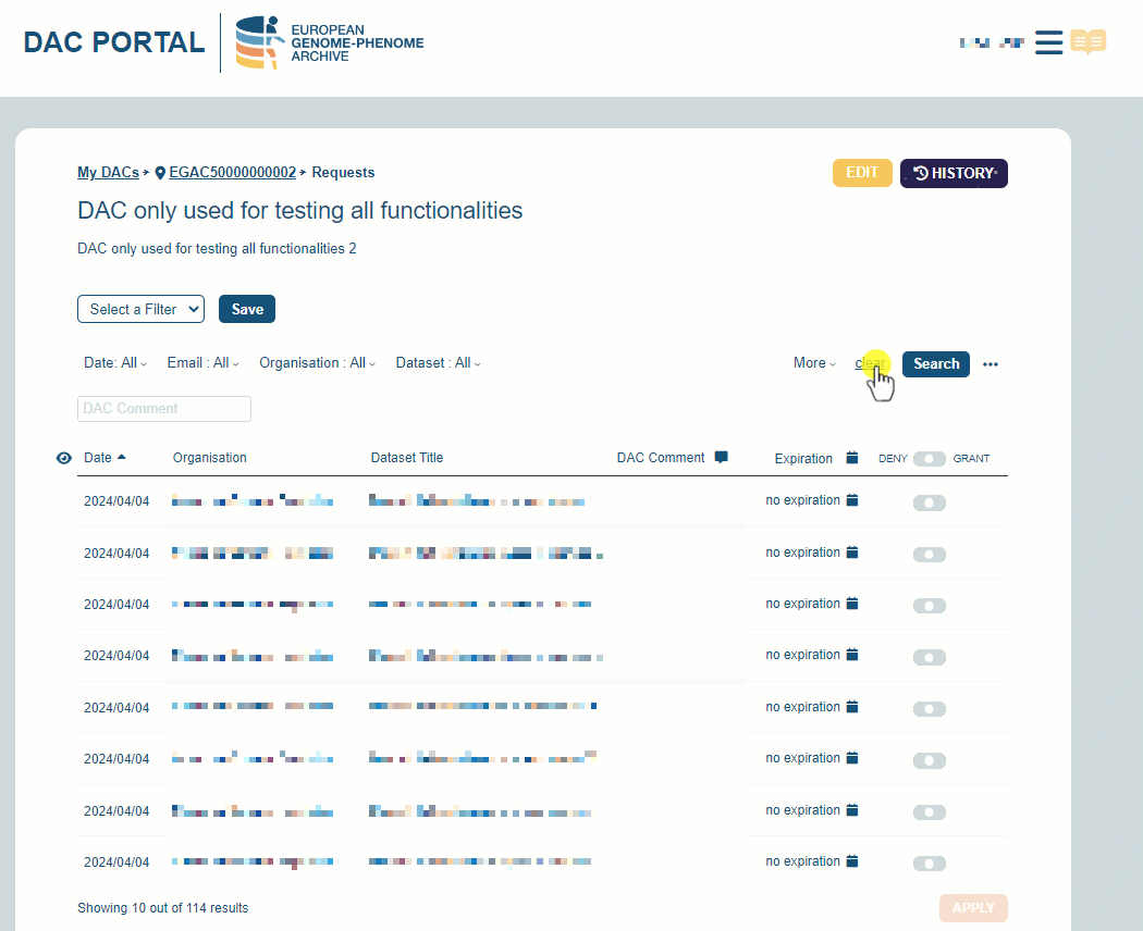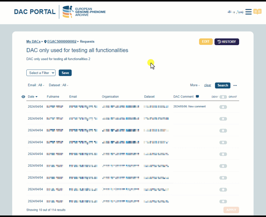 Do you have a pending request that you don’t want to receive a notification? Add a DAC comment! The EGA understands that a request resolution can take some time, for this reason, if you add a comment (make sure you save it by clicking the APPLY button!) we will filter those requests at the time of sending the notification!