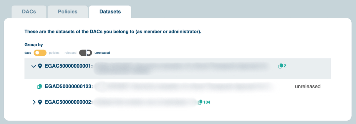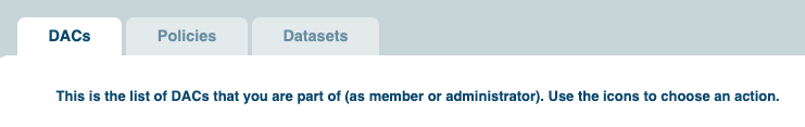 Finally, in the dataset tab, by default you will see a list of all the datasets you can manage with all your DACs and policies.
