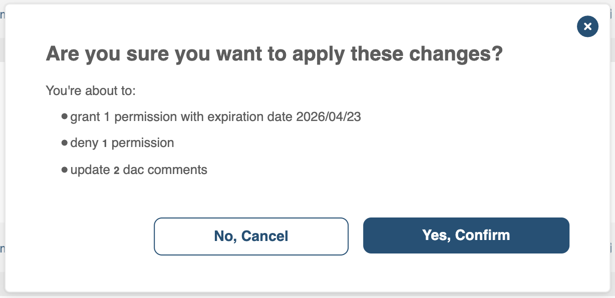 - You can grant and deny permissions in the same action, simplifying the process. The confirmation box will provide a summary of all actions, including grants, denials, DAC comments, and expiration dates.