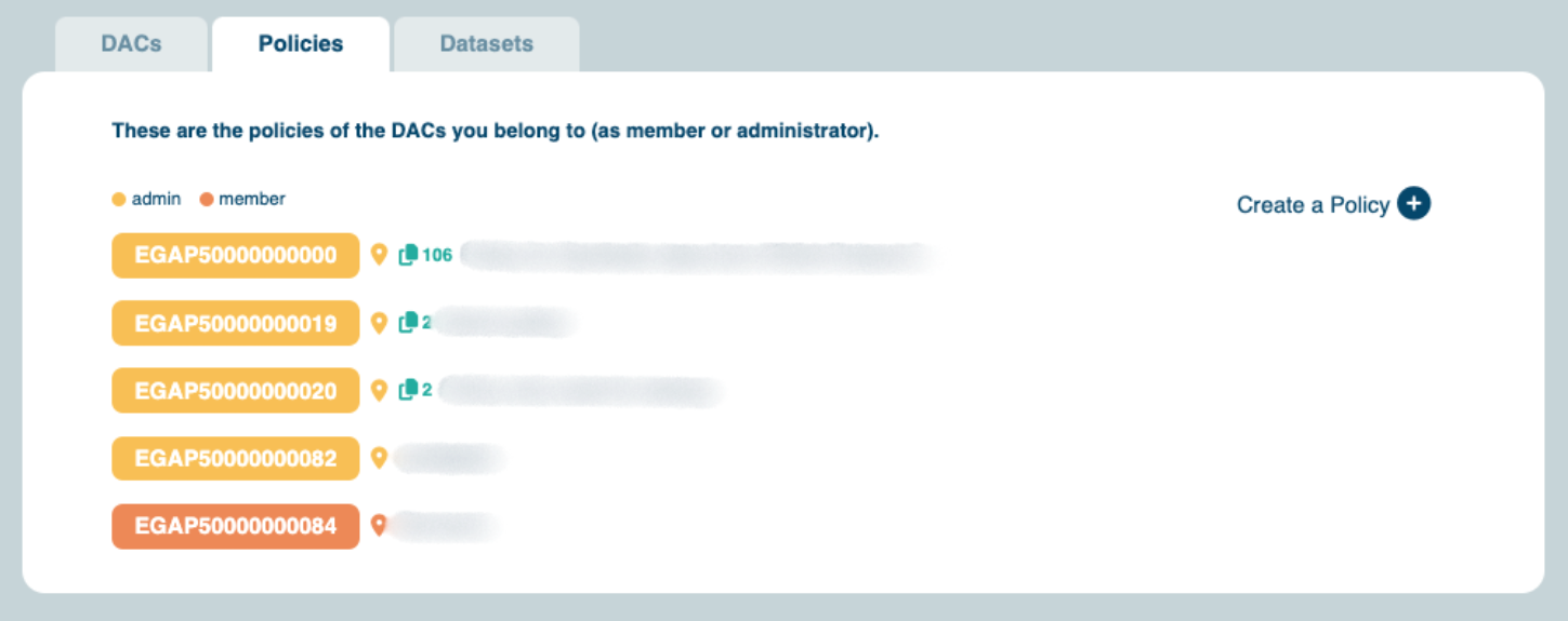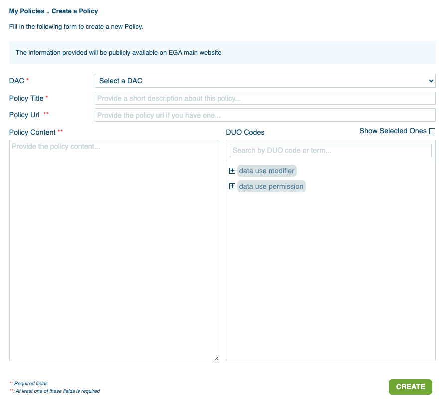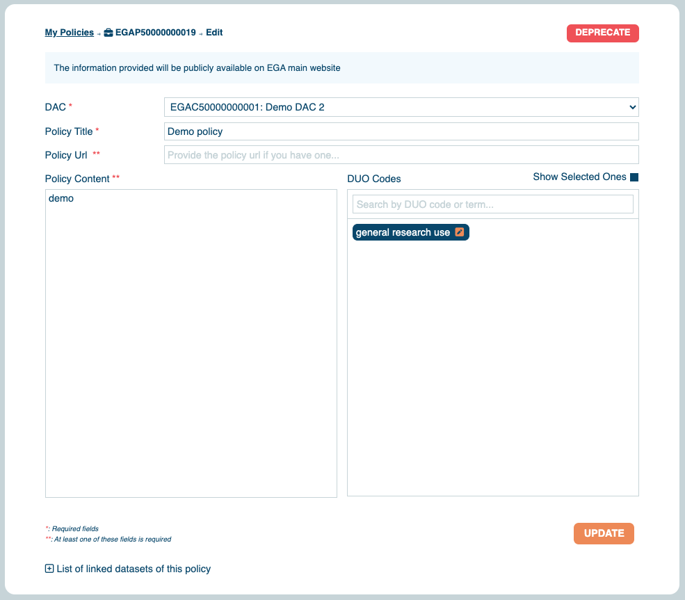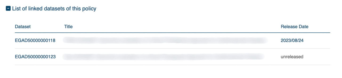 First, please note that all information registered in a policy metadata object will be publicly available on the EGA website. For each released dataset, all users will be able to read the policy under the “Data Access” tab.
