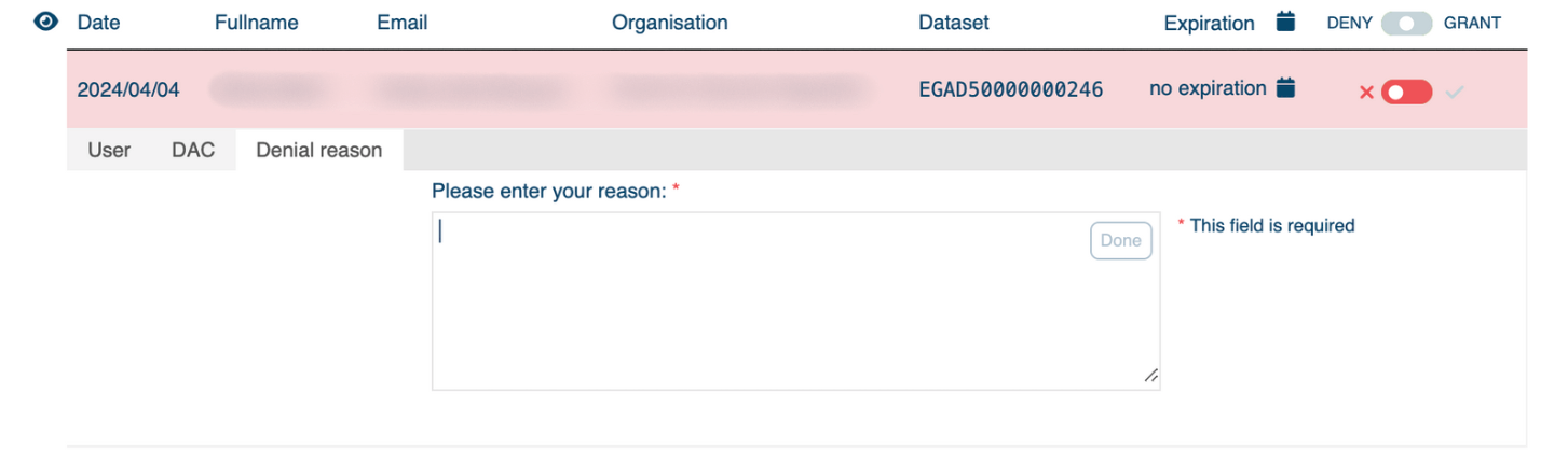 - Provide a reason for the denial. Note that the user will receive an email with this reason.