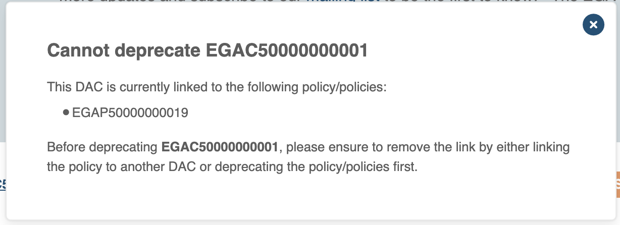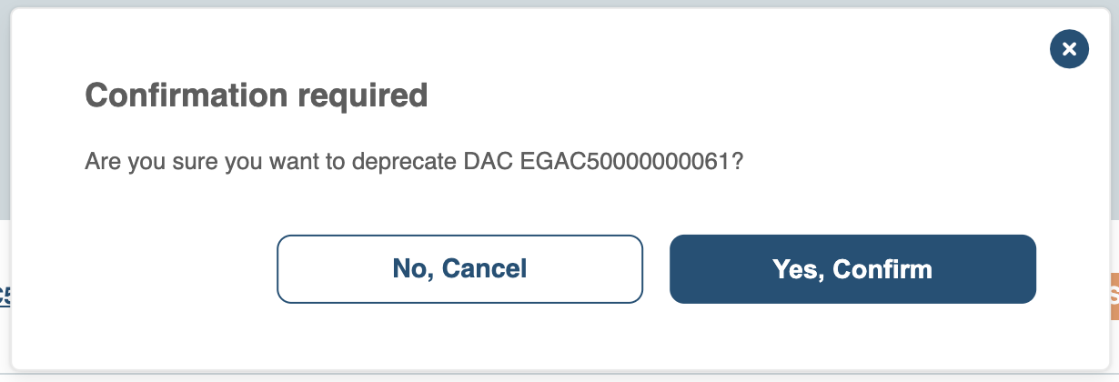You can only deprecate DACs and Policies. To deprecate a dataset, please contact our Helpdesk team.