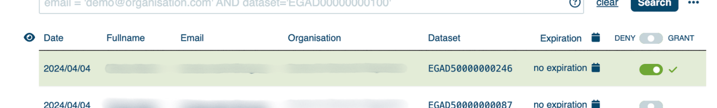 - Permission Revoked: Indicates that permissions were previously granted but have since been revoked. Users with permissions revoked have previously accessed the dataset.