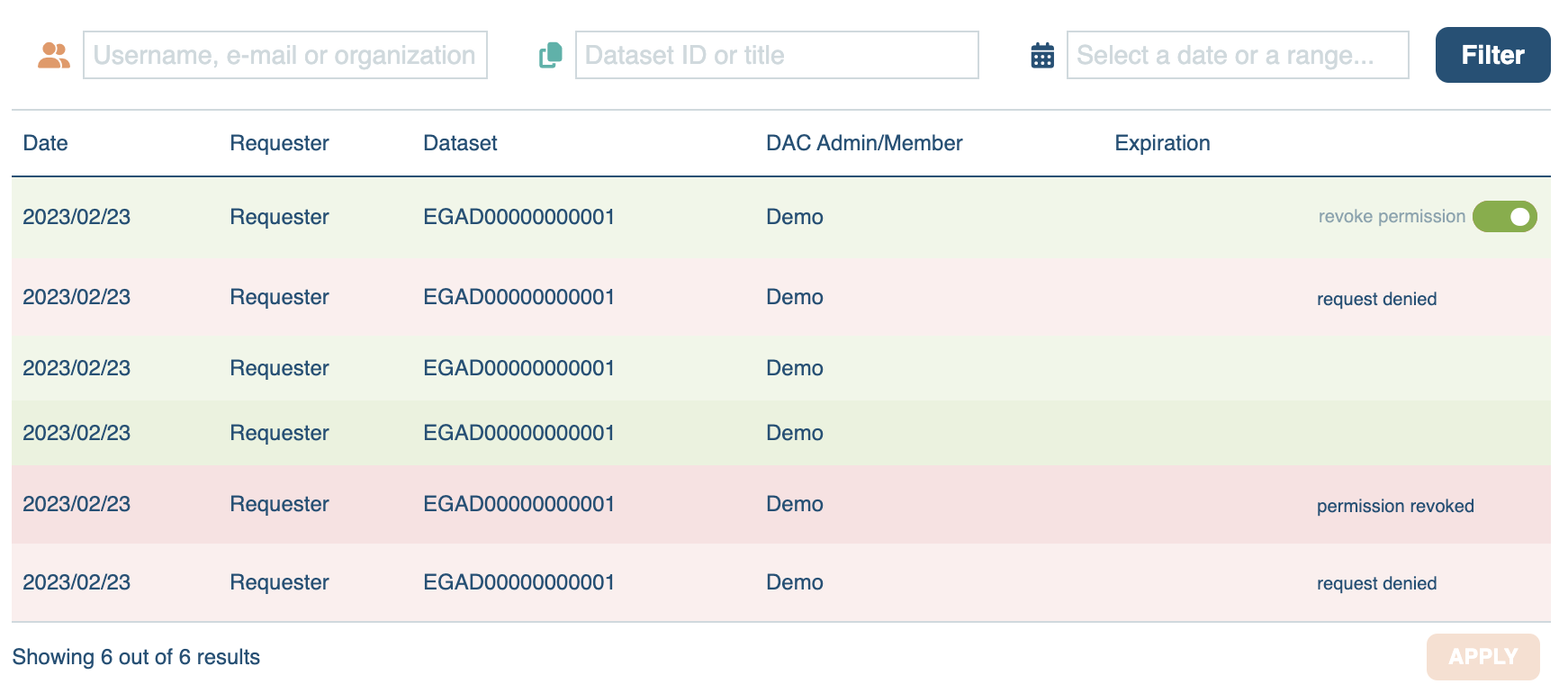 By default, all data access requests are displayed. However, you have the option to apply filters to refine your view. Follow these steps to apply filters: