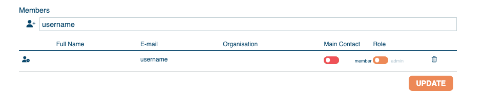 - To add a contact, you must write the username or email of a registered EGA user in the Members field. Once you have typed the whole username or email, a drop-down menu will appear where you can select the contact.