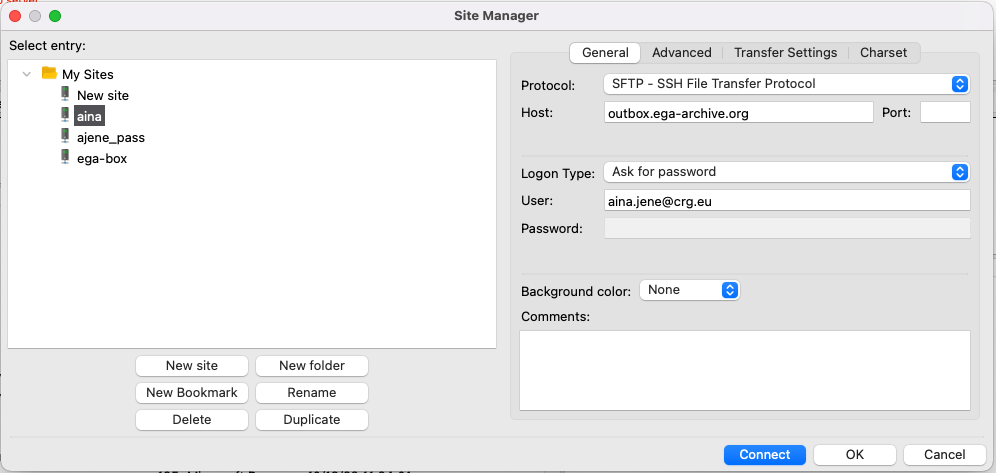 - Click Connect to access your Outbox. This folder serves as your storage space within the EGA cloud, containing files accessible for download in a secure way.