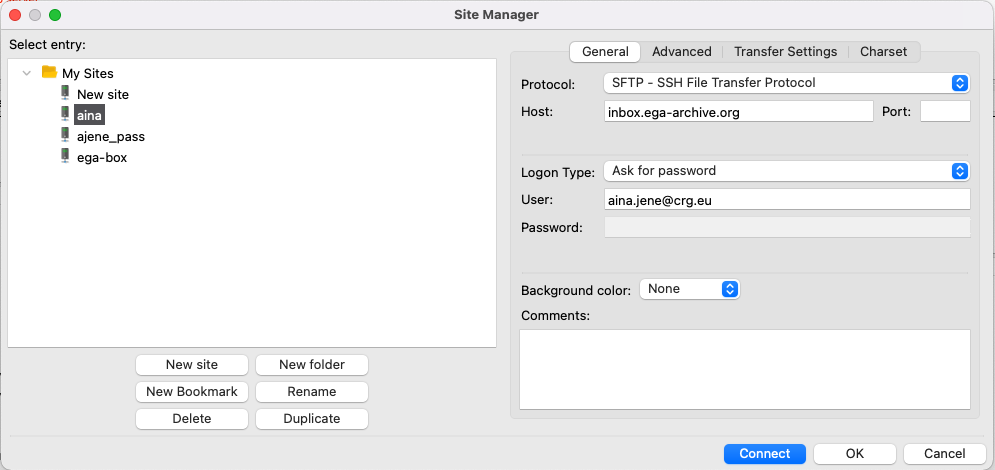- Click Connect, and you will log in remotely to your home directory. You can think of this folder as a storage "in the EGA cloud" in which you will add your files for the EGA. The uploading area has three folders: