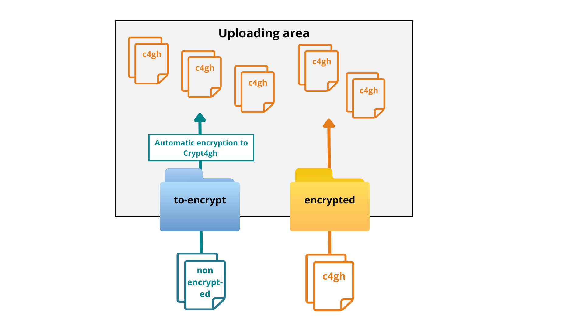 - Encrypted: Files uploaded in this folder must already be encrypted with Crypt4gh. Upload your files here if your connection is unstable or you have problems completing the upload into-encrypt.